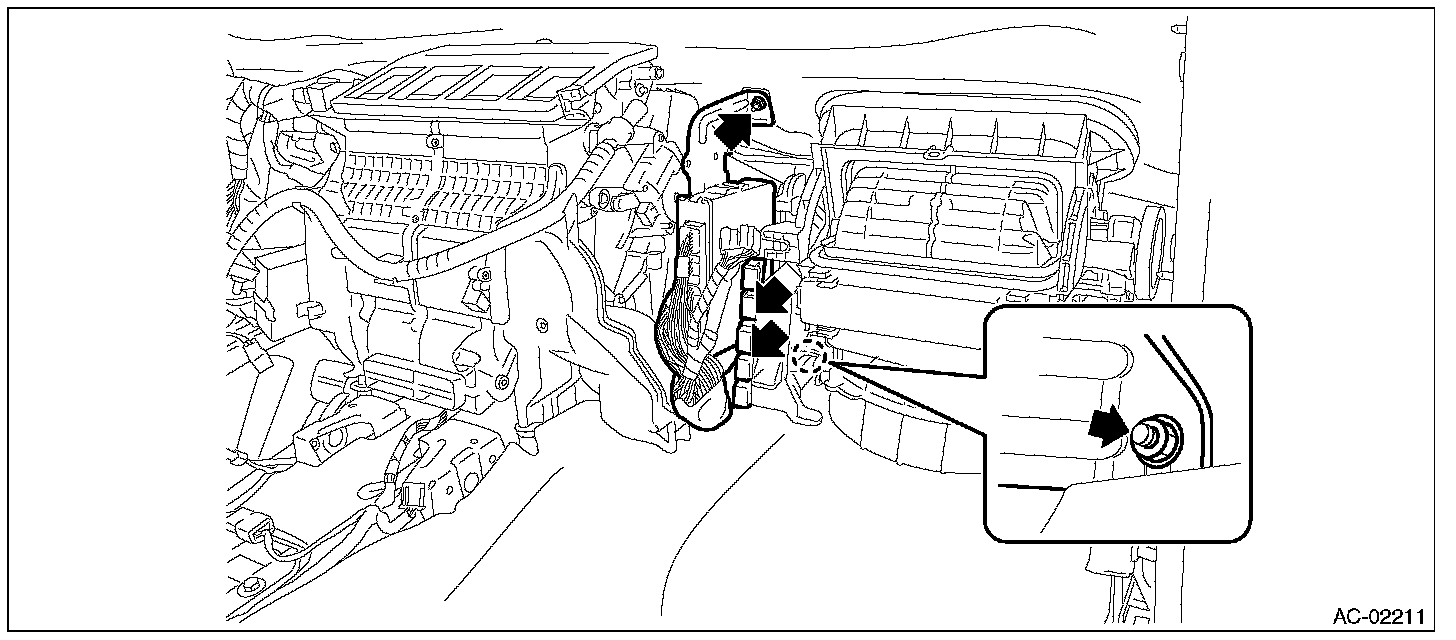4. Remove the connector and bolts, and remove the expansion valve and AC pipes from the evaporator.