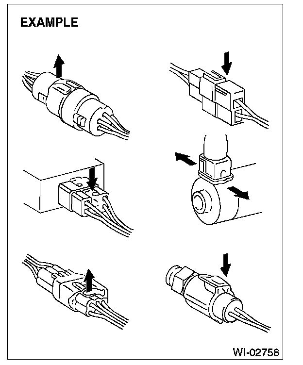 5. Some connectors are provided with a lock. One type of such a connector is disconnected by pushing the lock, and the other, by moving the lock up. In either type the lock shape must be identified before attempting to disconnect the connector.