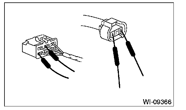 6. When checking continuity between connector terminals, or measuring voltage across the terminal and ground, always contact tester probe(s) on terminals from the wiring connection side. If the probe is too thick to gain access to the terminal, use "mini" test leads.