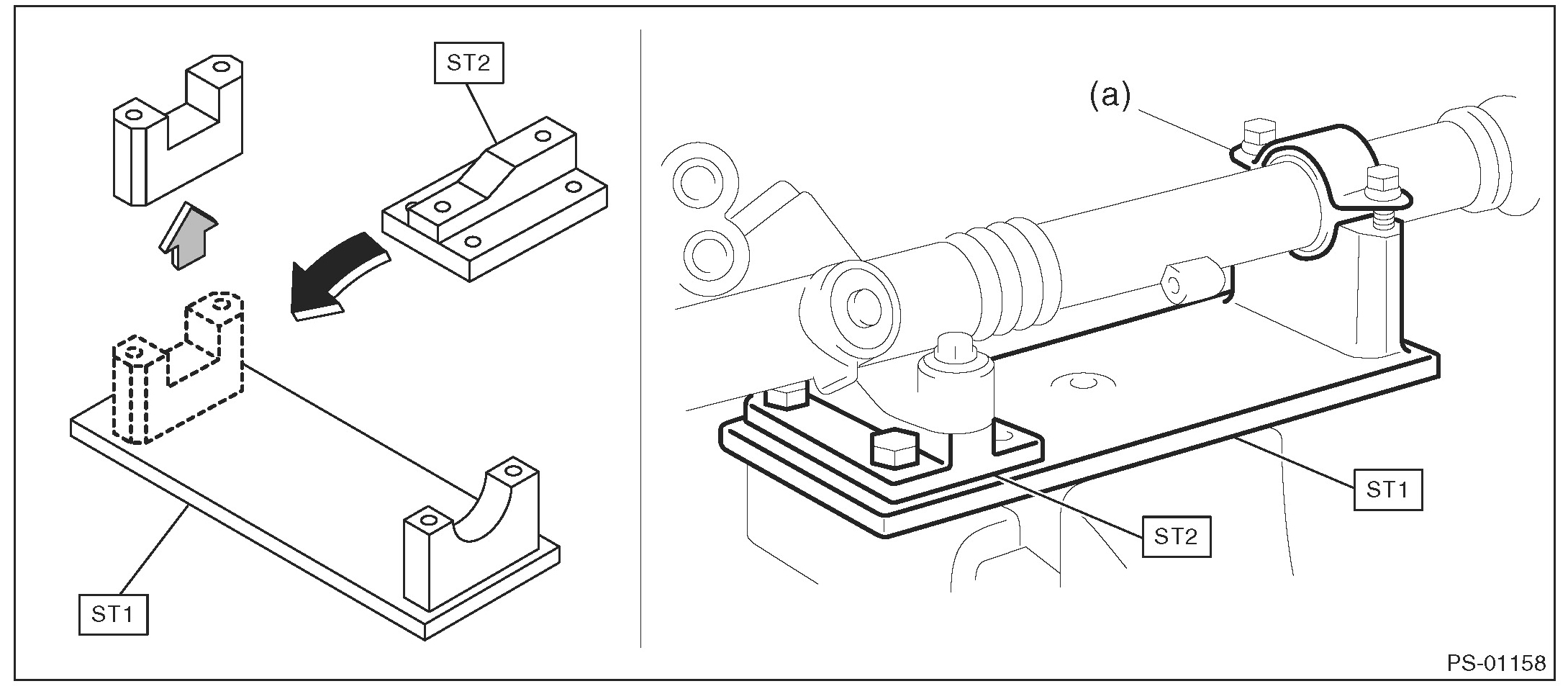 (2) Using the clamp (a) removed from vehicle body, attach the gearbox assembly to ST.