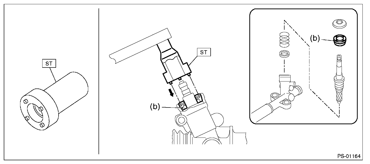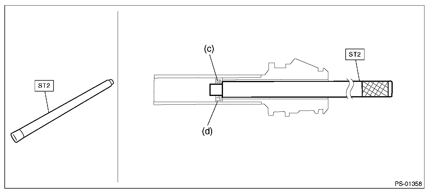 (4) Insert the ST2 from the valve side of the rack, and push out the back-up ring (c) and oil seal (d).