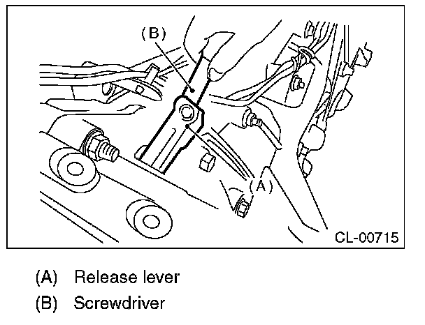 6) Remove the lever spring from the pivot with a screwdriver by accessing it through the clutch housing release lever hole. Then remove the release lever and release bearing as a unit. (turbo model)