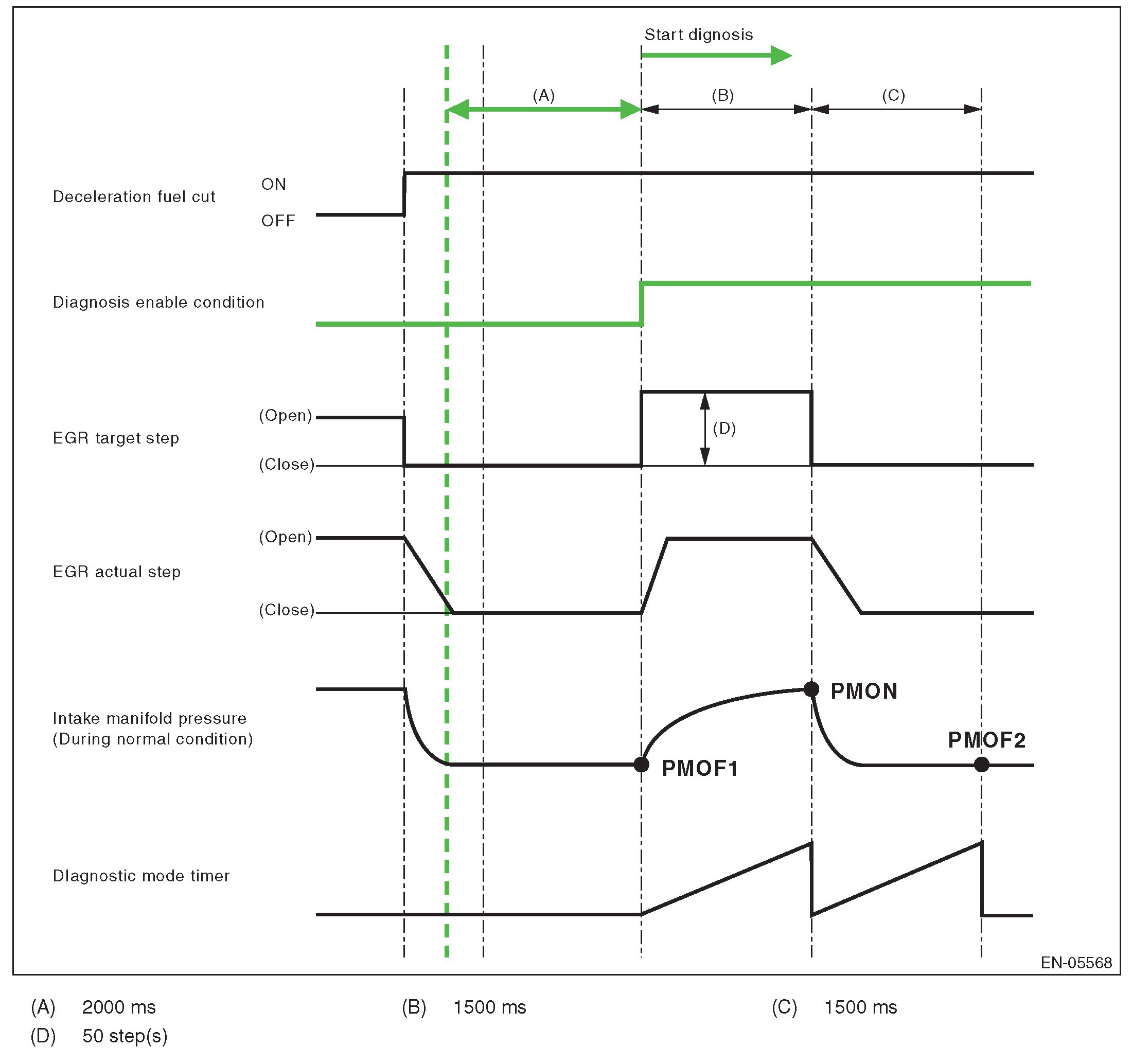 2. Label the intake manifold pressure value as PMON, which is observed after one second has passed since EGR target step was set to 50 steps (when the enable conditions were established), and set the EGR target step to 0.