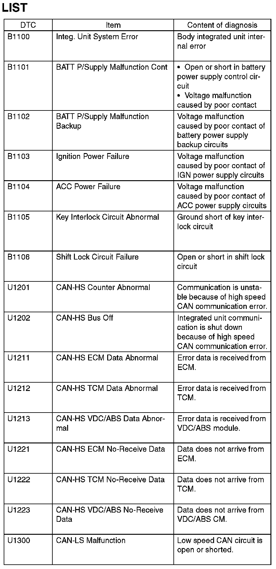 List of Diagnostic Trouble Codes (DTC)
