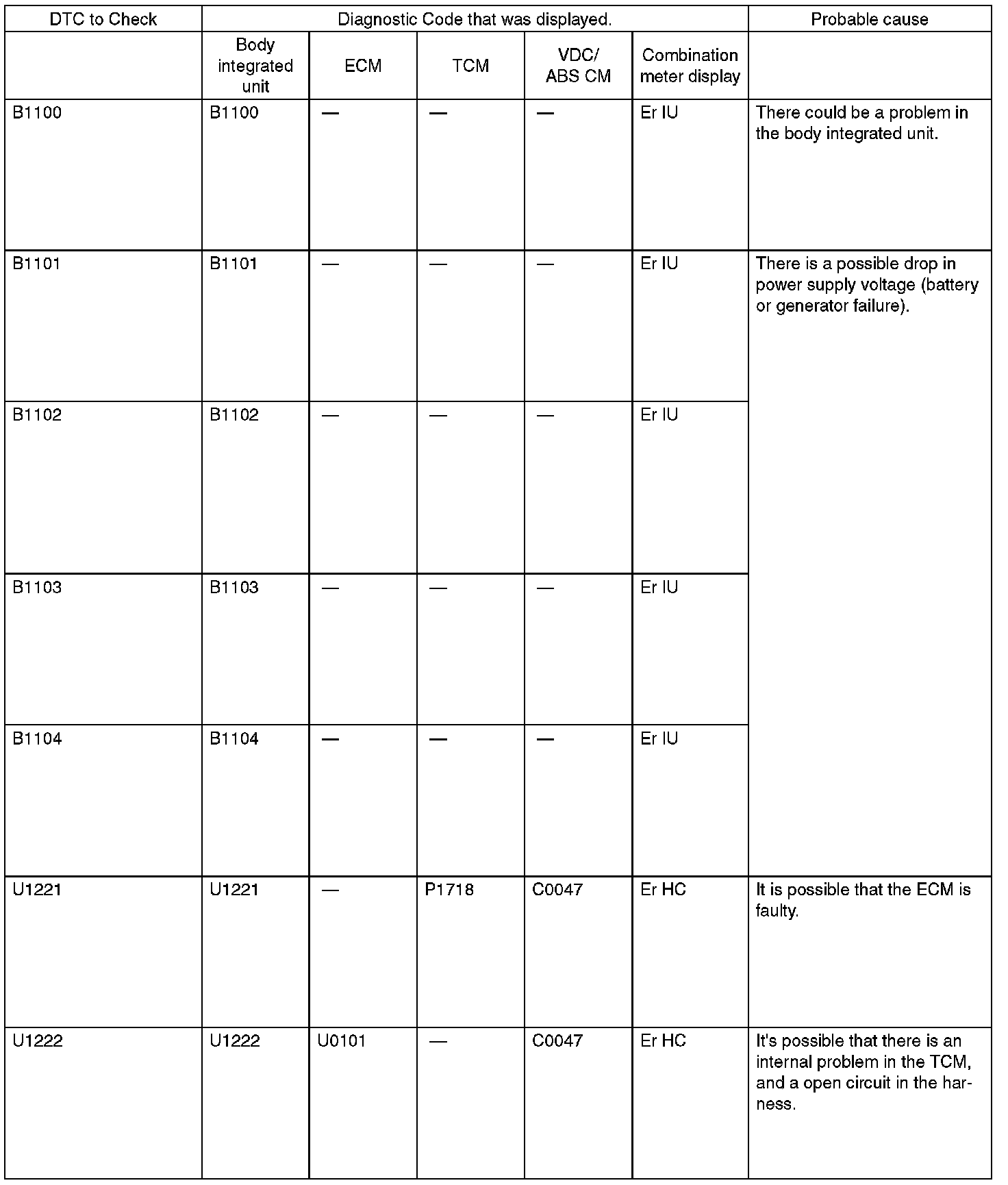 When more than two DTC codes are recorded, referring to their combination will make it easy to identify the possible cause. Refer to the list for typical examples.