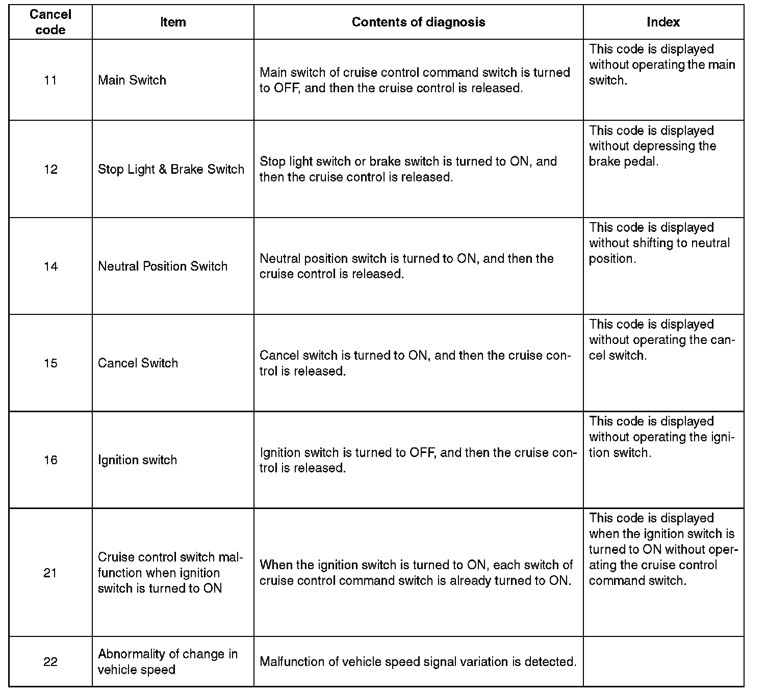 - To display a cancel code, use the Subaru Select Monitor to read the code after the cruise control is deactivated during a driving test.