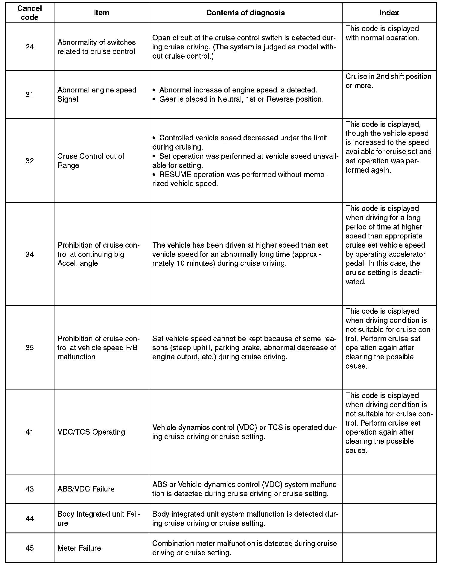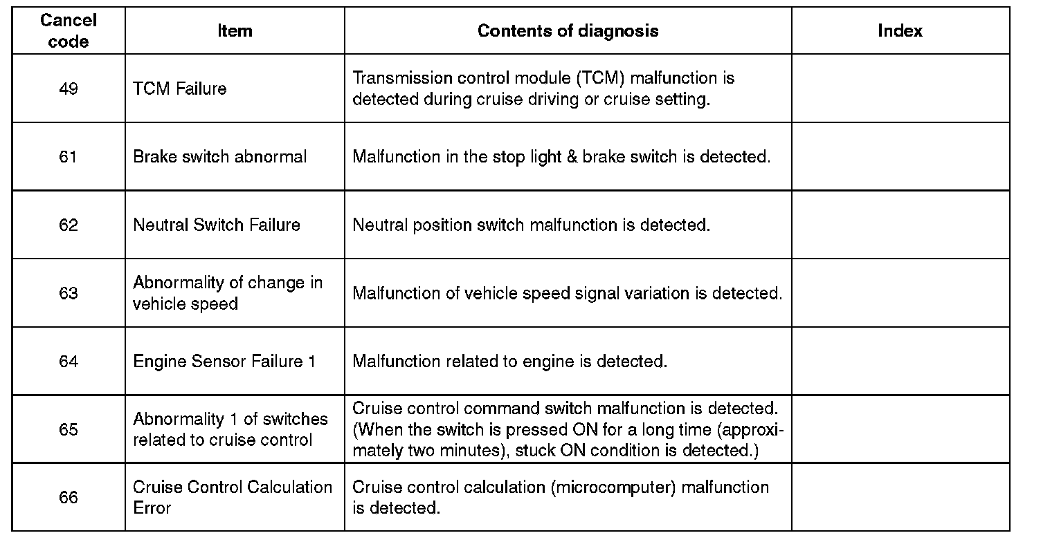 - If the cruise indicator light is flashing, a malfunction is occurring in the system or cruise control related switch. The cancel code at this time is saved even after ignition switch is OFF as a memory code of a past malfunction.
