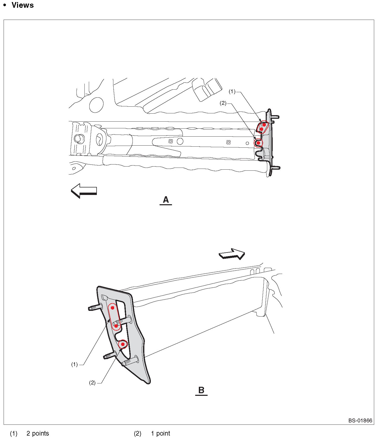 - Symbols and number of points indicate the welding method and the number of welding points. Text in brackets indicate the direction of removal for welded parts, and numbers indicate the number of panels to be drilled to remove welded sections of panels.