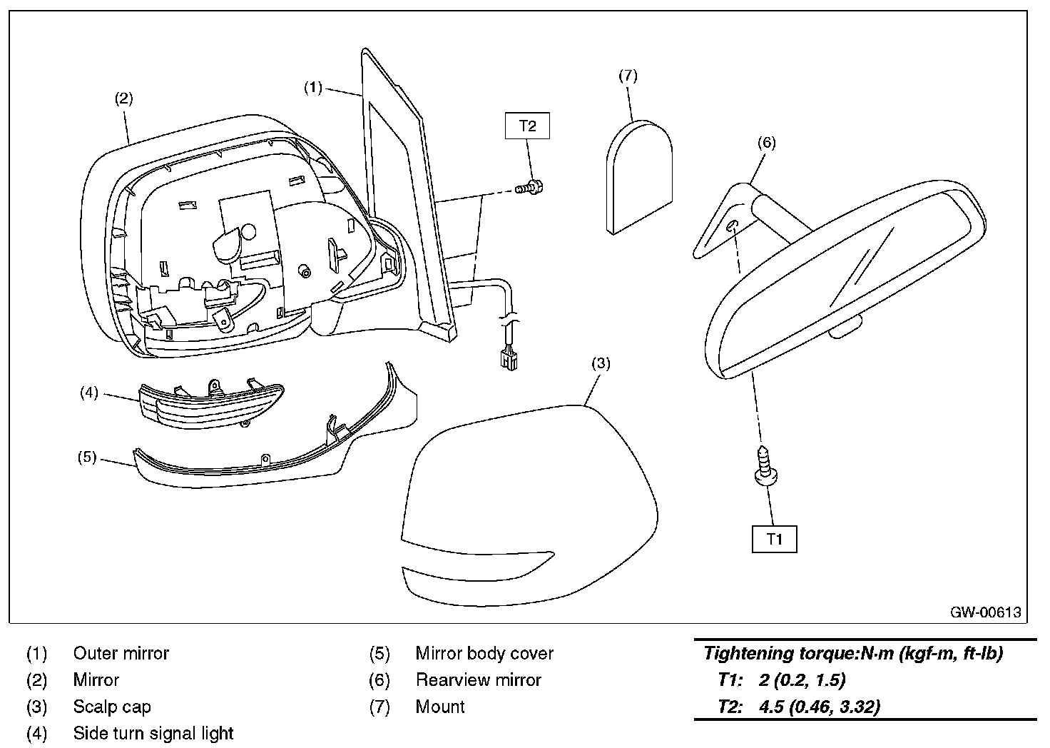 CAUTION: Claw (B) cannot be disengaged from the inside of the outer mirror. When removing, be careful not to damage the parts.