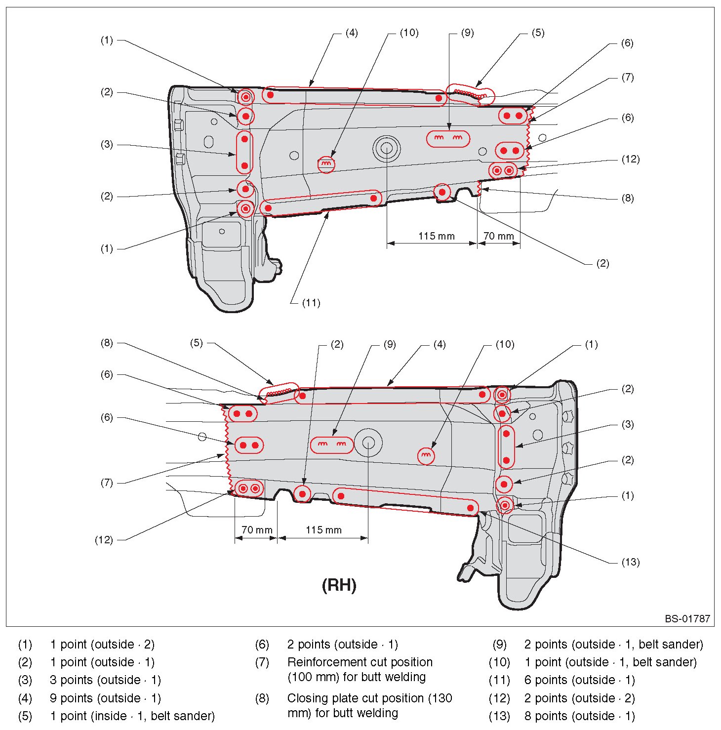 - Symbols and number of points indicate the welding method and the number of welding points. Text in brackets indicate the direction of removal for welded parts, and numbers indicate the number of panels to be drilled to remove welded sections of panels.