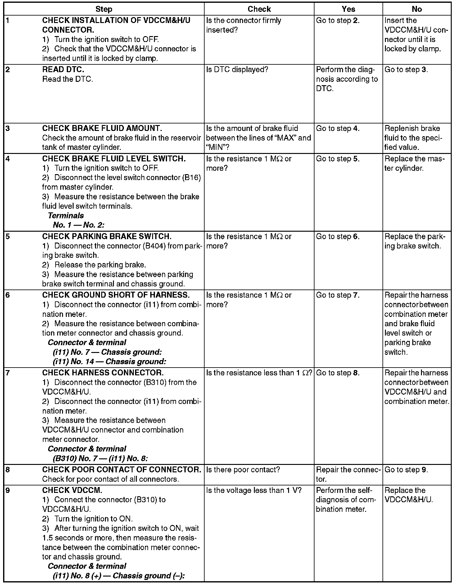 After starting the engine, the brake warning light remains lit though the parking lever is released.