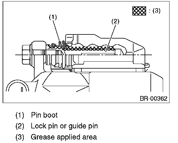 7) Apply grease contained in the piston seal kit to the guide pin, outer surface, sleeve outer surface, cylinder inner surface, and boot grooves.