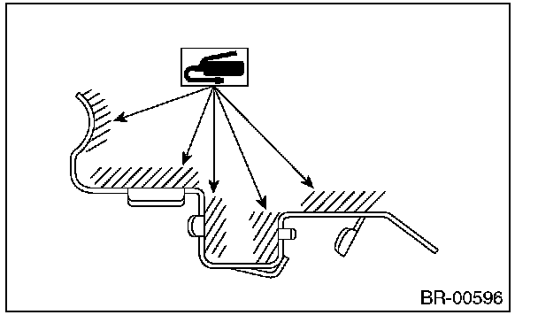 1) Apply a thin coat of Molykote M7439 (Part No. K0770YA000) or grease contained in the pad kit to the pad clip.