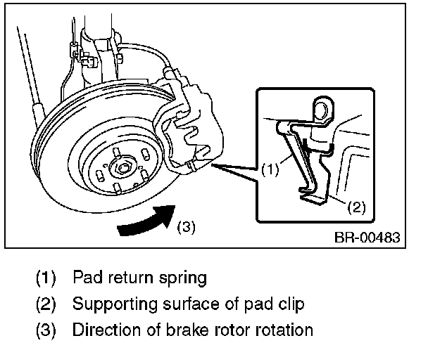 ^ Correctly install the pad return spring to the supporting surface of the pad clip as shown in the figure.
