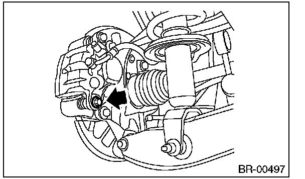 ^ A wear indicator is installed on the inner disc brake pad. If the pad is worn to the limit, the end of wear indicator contacts disc rotor, and a squeaking sound is heard as the wheel rotates. If the sound is heard, replace the pad.