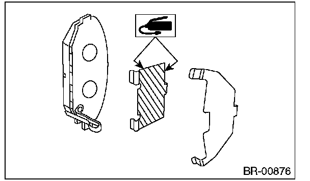 2) Apply a thin coat of Molykote AS880N (Part No. K0777YA010) or the grease contained in the pad kit to the contact surface between the outer-side pad and shim.