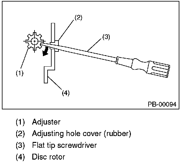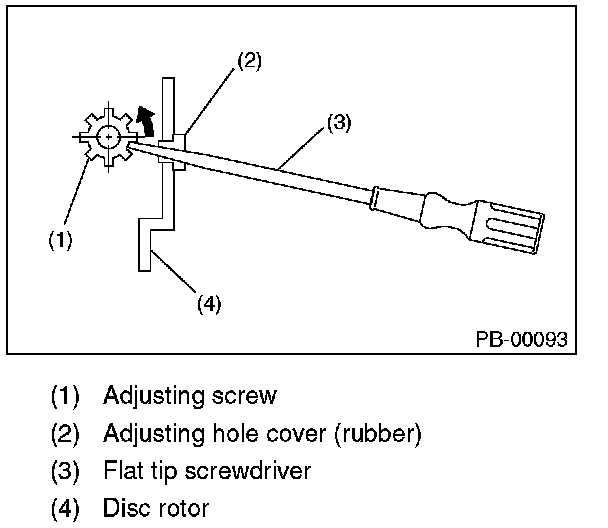 (1) Turn the adjusting screw using a flat tip screwdriver until the brake shoe moves adequately away from the disc rotor.