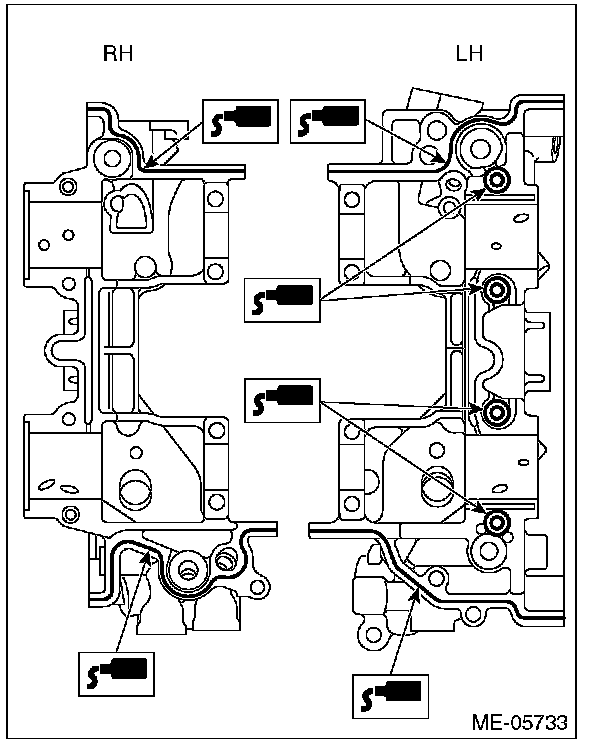 ^ Do not apply liquid gasket excessively. Applying excessively may cause excess gasket to come out and flow toward cam journal, resulting in engine seizure.