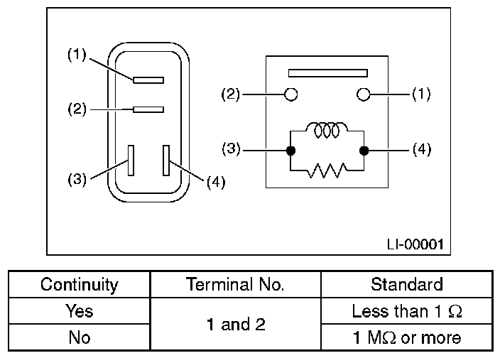 Connect terminal No. 4 to the battery positive terminal and terminal No. 3 to the battery ground terminal, and measure the headlight relay resistance between terminals.