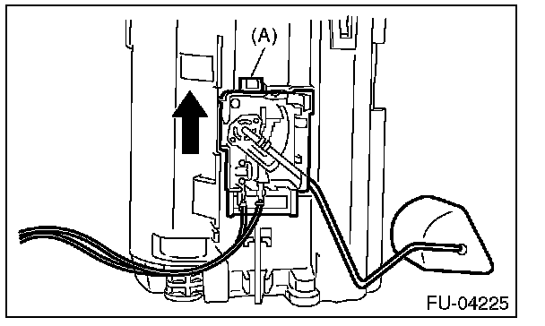 4. Slide the fuel level sensor in the direction of the arrow and remove the fuel level sensor by pressing the claw (A) of the fuel level sensor.