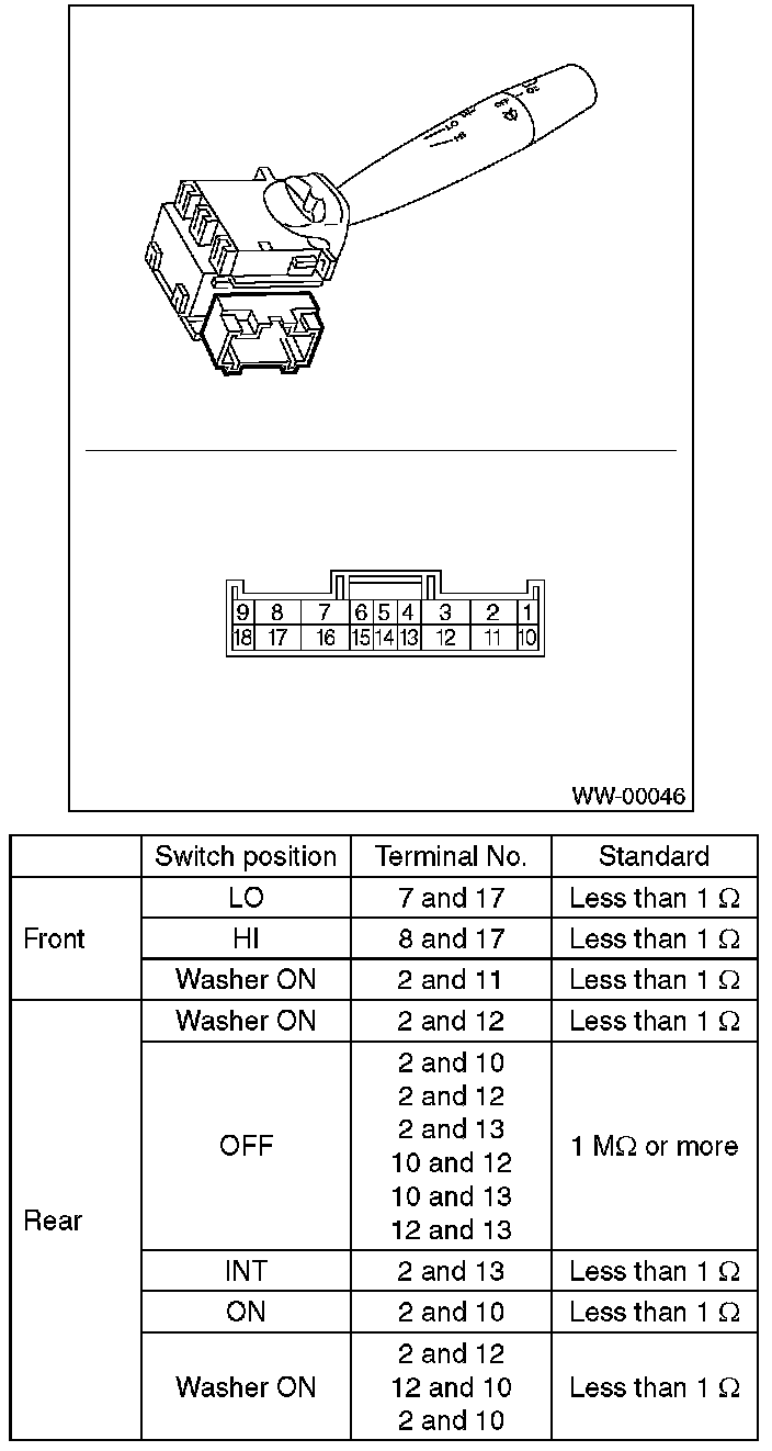 3. Check of vehicle speed signal harness Measure the resistance between the wiper switch connector and the VDC control module.