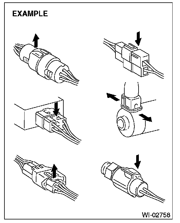 5. Some connectors are provided with a lock. One type of such a connector is disconnected by pushing the lock, and the other, by moving the lock up. In either type the lock shape must be identified before attempting to disconnect the connector.