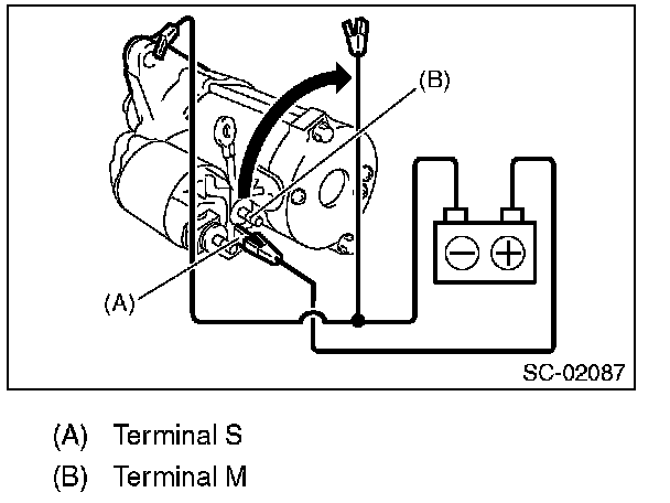 With terminal S connected to the positive terminal, and terminal M and starter body connected to the battery ground terminal to suction the main contact point, check that the pinion gear returns to its original position when terminal S is disconnected.