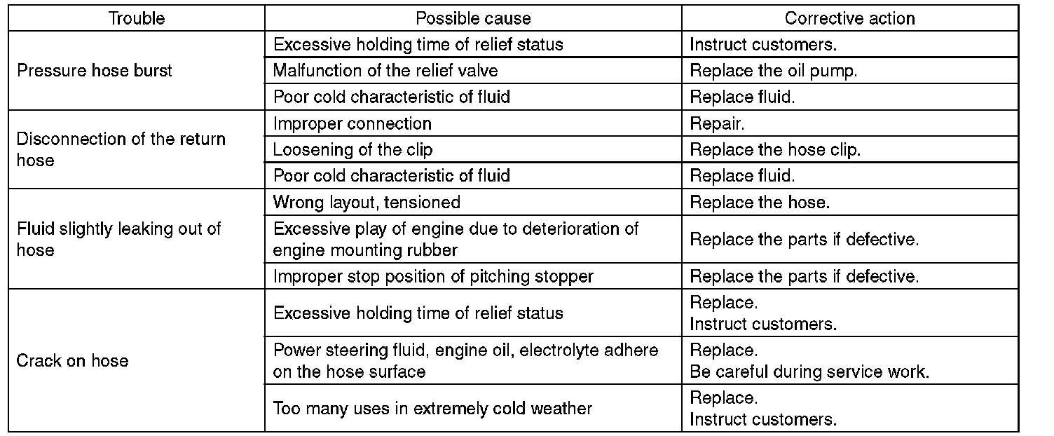 Although the surface layer materials of rubber hoses have excellent weathering resistance, heat resistance and resistance for low temperature brittleness, they are likely to be damaged chemically by brake fluid, battery electrolyte, engine oil and automatic transmission fluid and their service lives are to be very shortened. Wipe off hoses immediately if any of these come into contact with the hoses. Since resistances for heat or low temperature brittleness are gradually declining according to time accumulation of hot or cold conditions for the hoses and their service lives are shortening accordingly, it is necessary to perform careful inspection frequently when the vehicle is used in hot weather areas, cold weather areas and a driving condition in which many steering operations are required in short time.