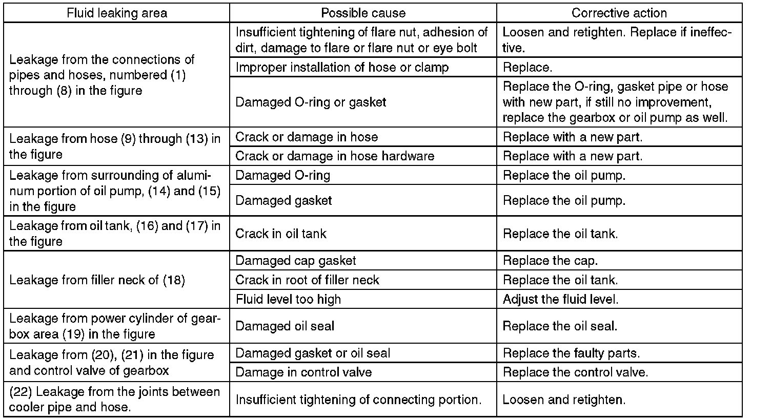 There are conditions in which a fluid leak is diagnosed, but is not actually leaking. This is because the fluid spilt during the last maintenance was not completely wiped off. Be sure to wipe off spilt fluid thoroughly after maintenance.