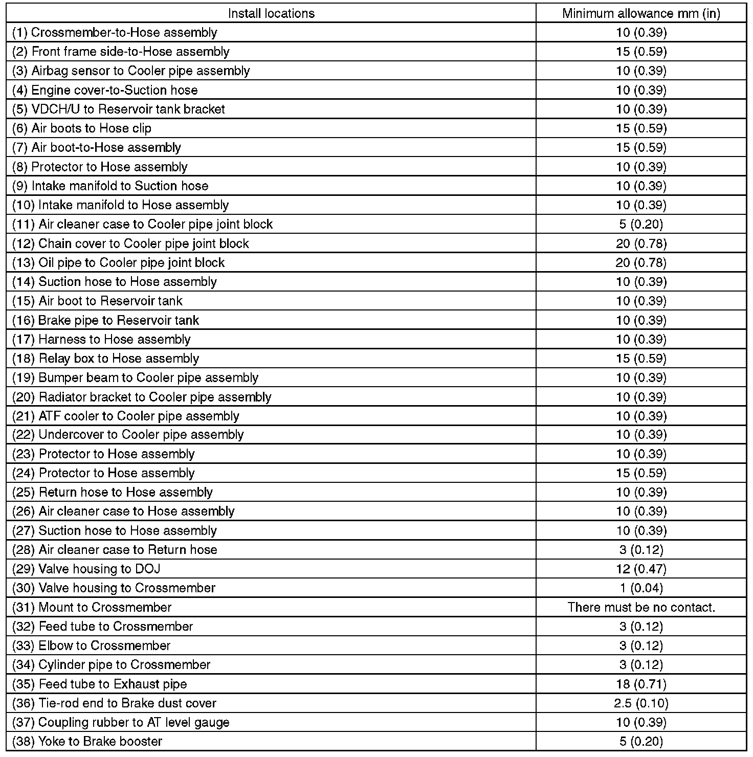 This table lists various clearances that must be correctly adjusted to ensure the normal vehicle driving without interfering noise, or any other faults.