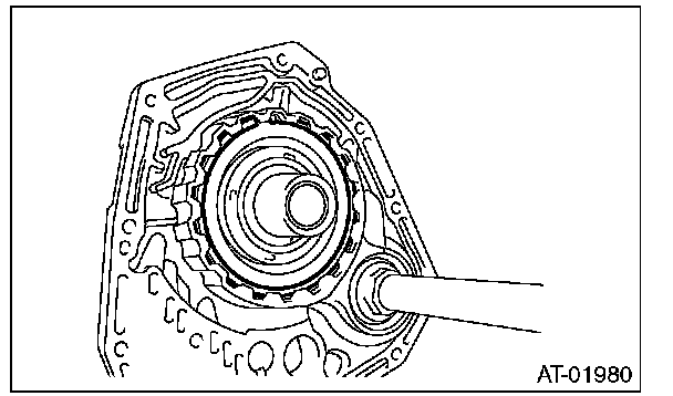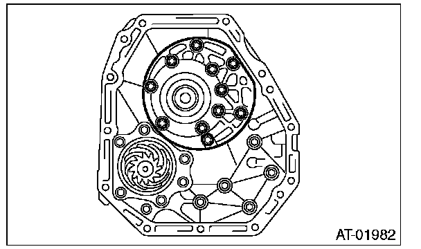7) Remove the oil pump cover mounting bolt, and then separate the oil pump cover from the AT main case by lightly tapping with plastic hammer.