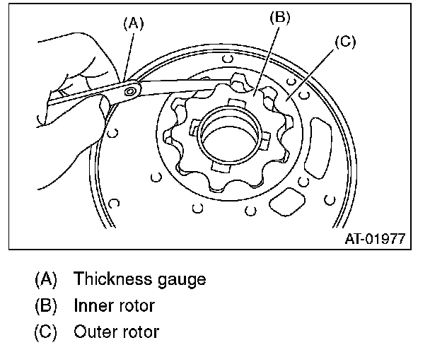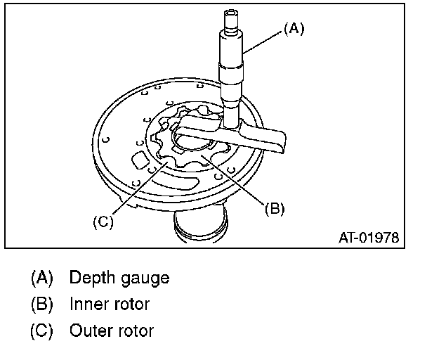 Set a depth gauge to oil pump housing, then measure the oil pump housing-to-rotor clearance.