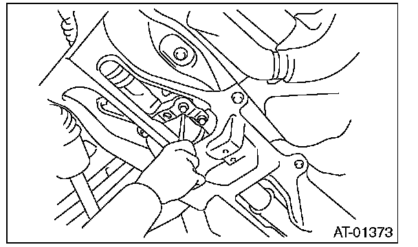 ^ Be careful not to allow breather pipe and etc. to touch the vehicle body when detaching the automatic transmission assembly by pulling it backward.