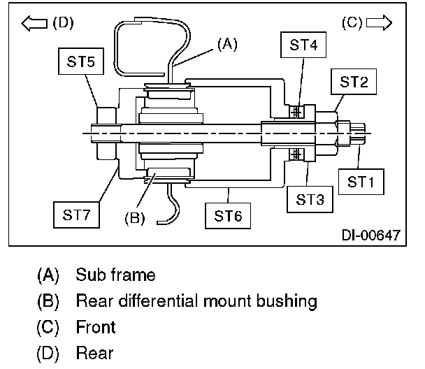 (4) Secure the edge of the shaft of ST1 with a spanner, and tighten the nut of ST2 until the rear differential mount bushing comes out of the sub frame.
