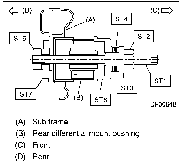 2) Remove the rear differential mount bushing using ST1 - 7.