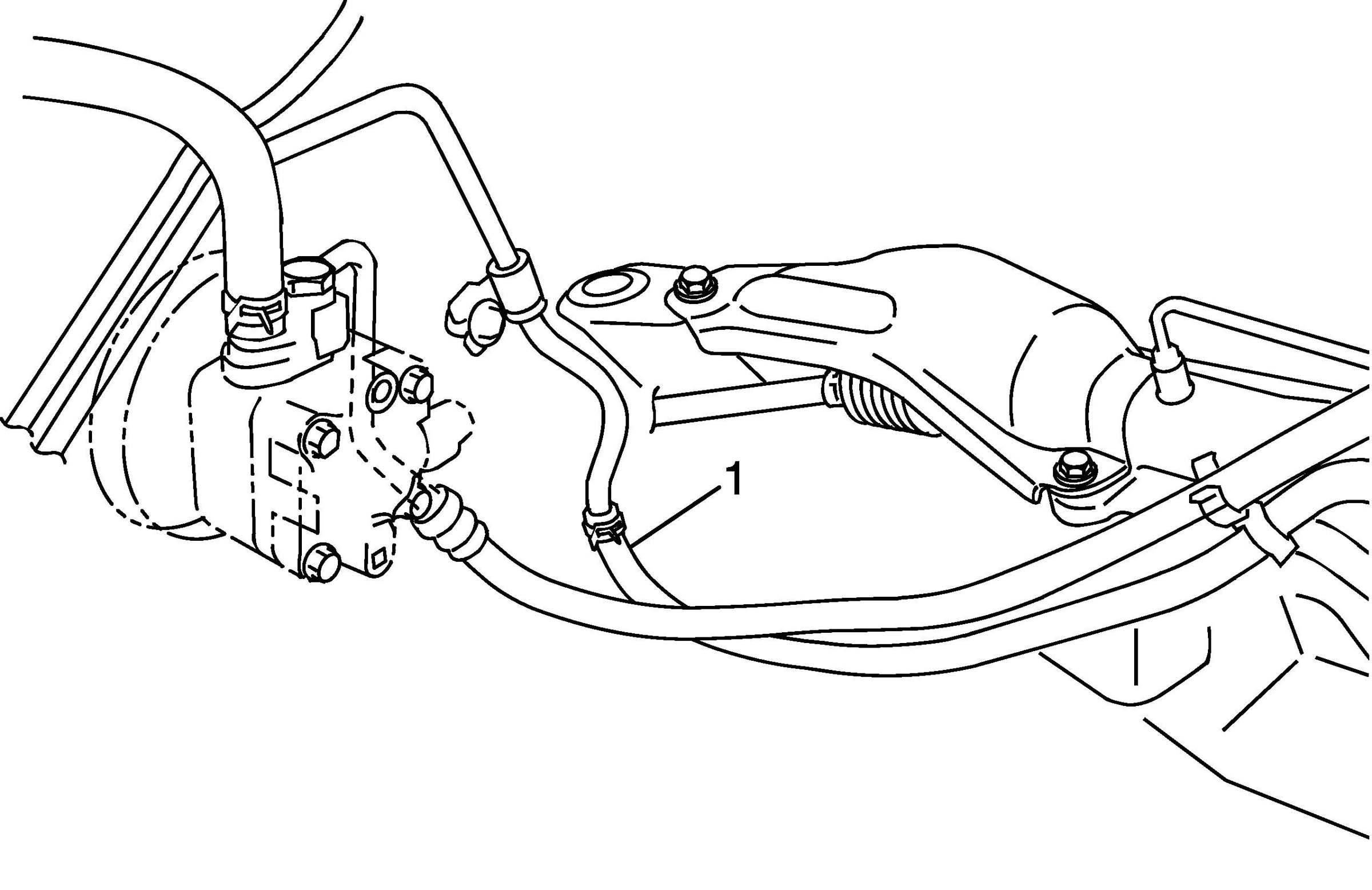3. When engine is cool, remove P/S gear low pressure hose (1) from pipe and drain P/S fluid from low pressure hose.
