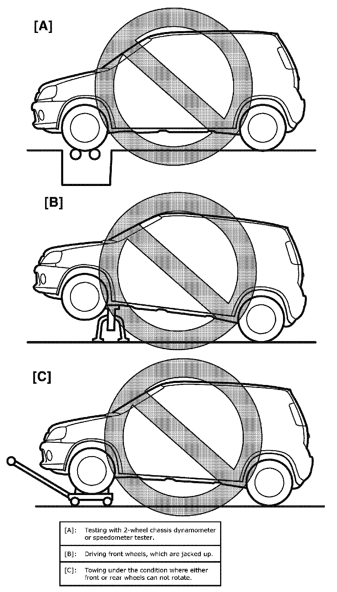 ^ Never perform any of the following [A], [B] and [C] types of service work. If it is performed while 4WD-auto mode or 4WD-lock mode is selected, front wheels (or rear wheels) drive rear wheels (or front wheels) and vehicle accident, drivetrain damage and personal injury may result. Also, if it is performed while 2WD mode is selected, the coupling may be damaged because of the difference in revolution speed between front wheels and rear wheels.