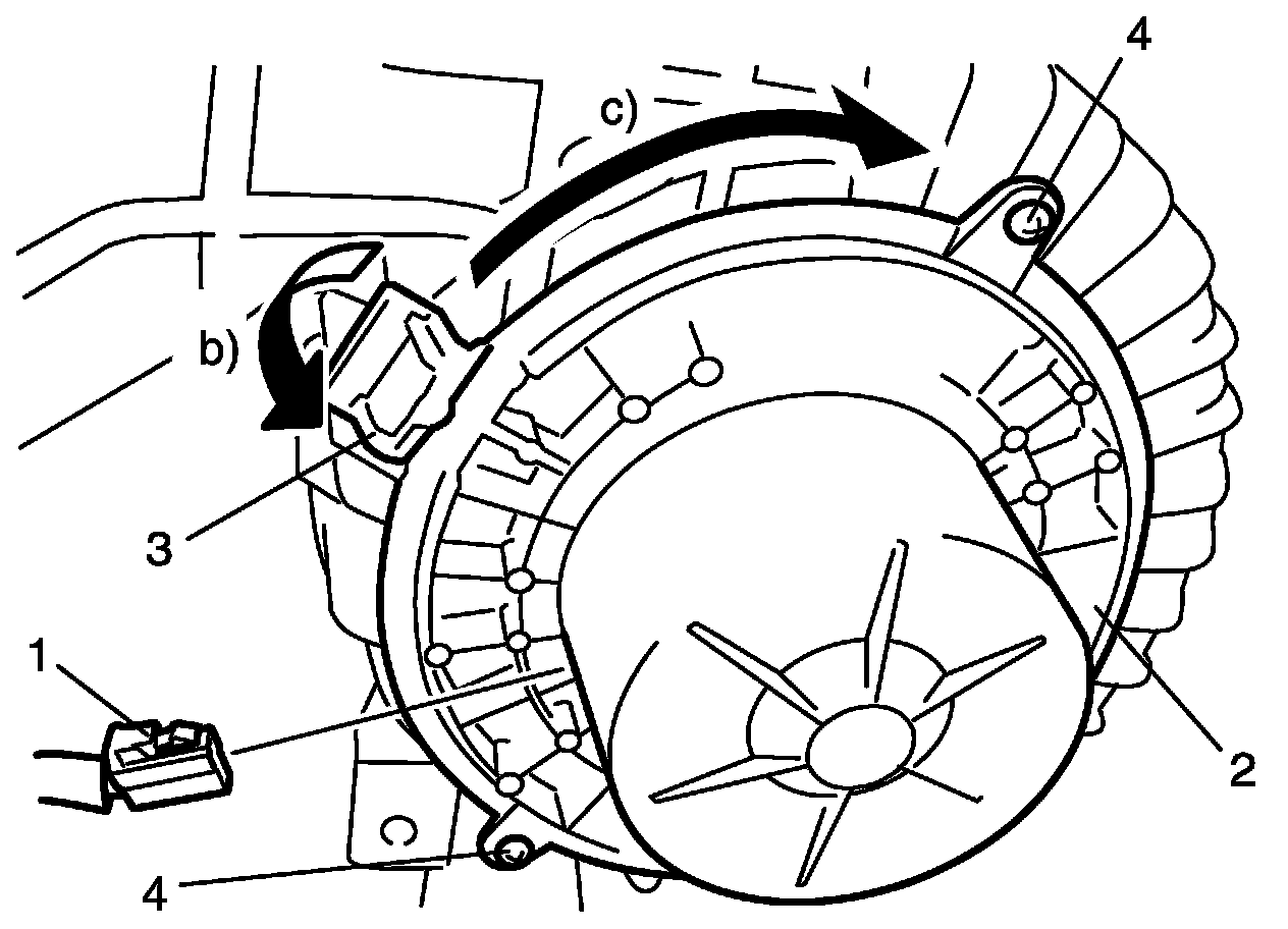 c. Hold Step b and turn blower motor (2) to arrow direction.