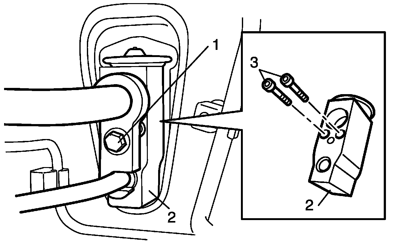 2. Loosen a bolt (1) and remove pipes from expansion valve (2).