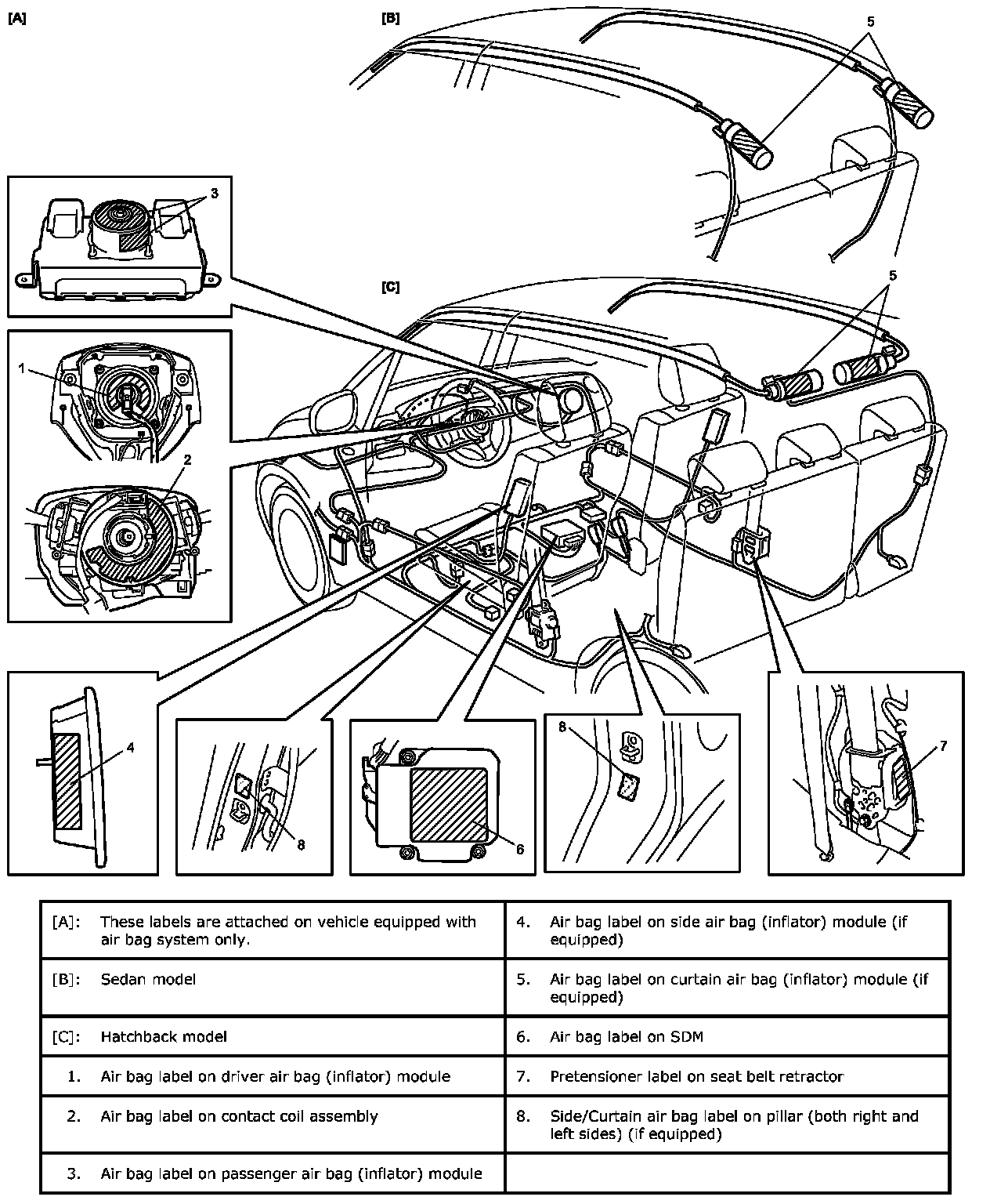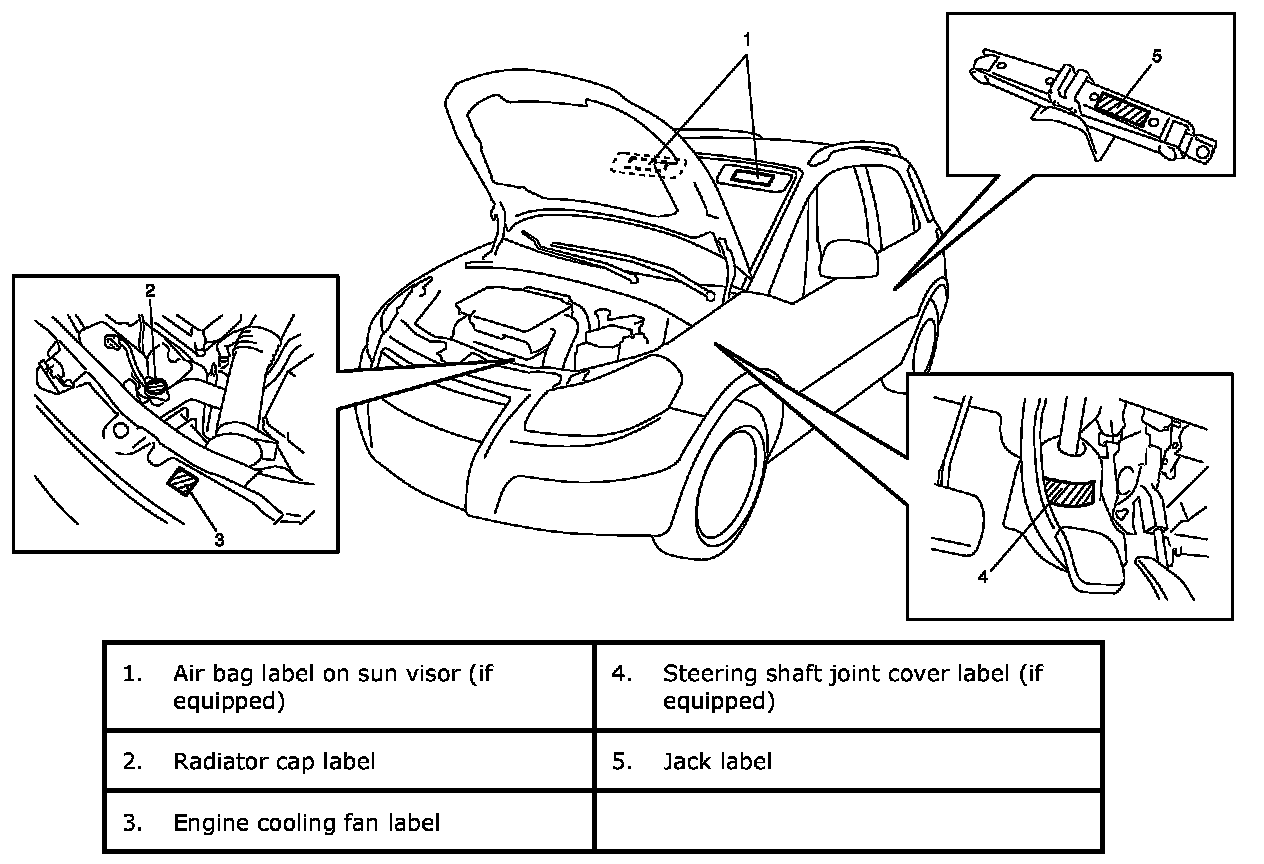The figure shows main labels among others that are attached to vehicle component parts. When servicing and handling parts, refer to WARNING / CAUTION instructions printed on labels. If any WARNING / CAUTION label is found stained or damaged, clean or replace it as necessary.