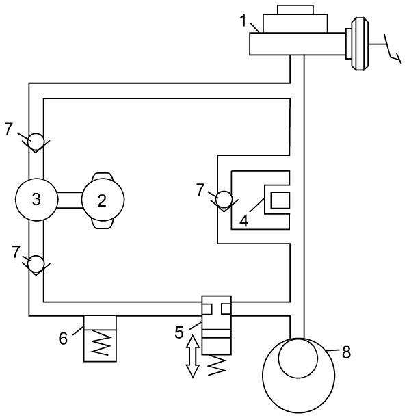 - ESP (R) hydraulic unit is composed of inlet solenoid valves (4) (normally-opened valves), outlet solenoid valves (5) (normally-closed valves), pumps (3) pump motor (2), reservoirs (6) and check valves (7). It activates the inlet and outlet solenoid valves by the signals from ESP (R) hydraulic unit / control module assembly and controls the brake fluid pressure applied on each wheel brake. (The following figure shows the circuit for one wheel, with inlet and outlet solenoid valves in OFF positions.)