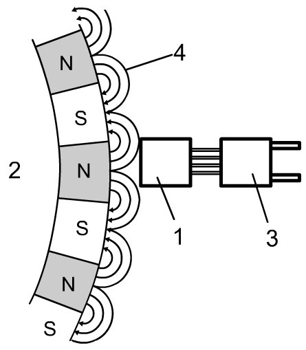 The encoder consists of a permanent magnet which has south poles and north poles. As it is located on the wheel hub it turns along with the wheel.