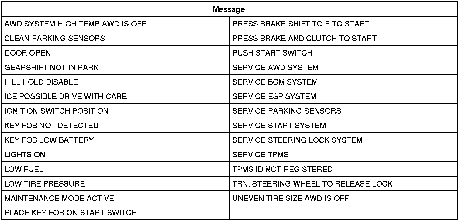 The information display indicates various items of information including CVT selector position, odometer, trip meter, outside temperature, instantaneous fuel consumption, average fuel consumption, brightness of instrument panel, direction and distance of an obstacle sensed by the parking sensor. The information display can also indicate the following messages related to vehicle.