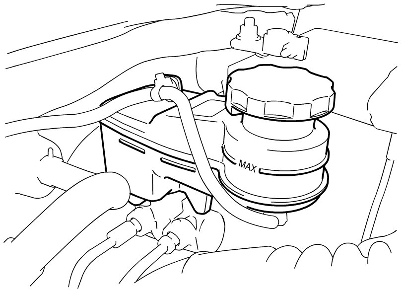 If fluid is lower than minimum level of reservoir, refill reservoir with specified brake fluid indicated on reservoir cap.