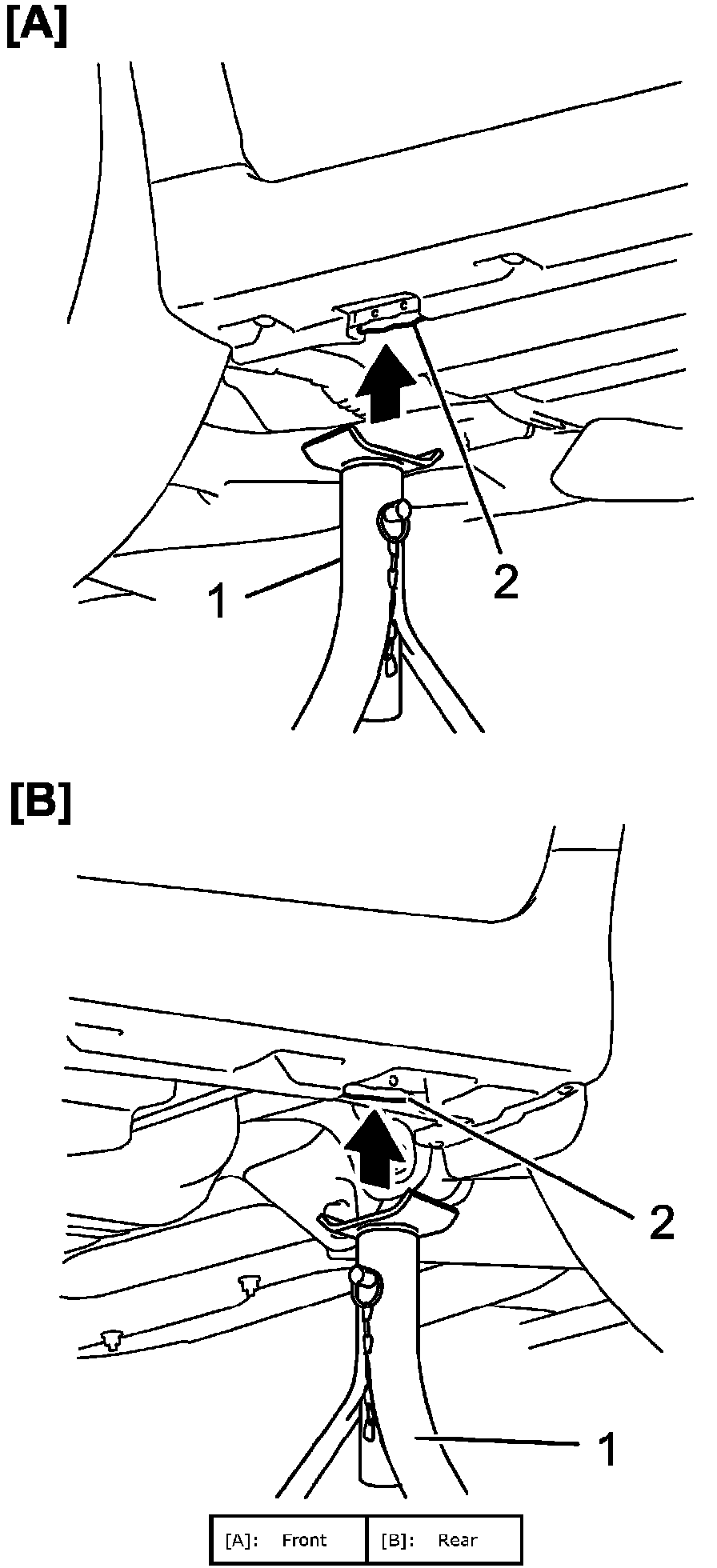 CAUTION: Never apply jack against rear suspension parts (i.e., stabilizer, etc.), vehicle floor or exhaust pipe No. 2 or it may get deformed.