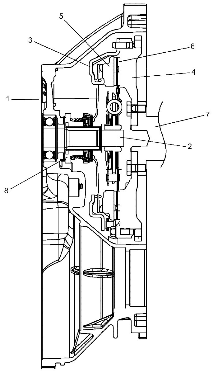 The disc, carrying four torsional coil springs, is positioned on the transaxle input shaft (2) with an involute spline fit.