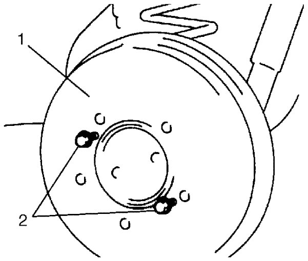 3) Remove brake drum (1) by using M8 bolts (2) (2 pcs).