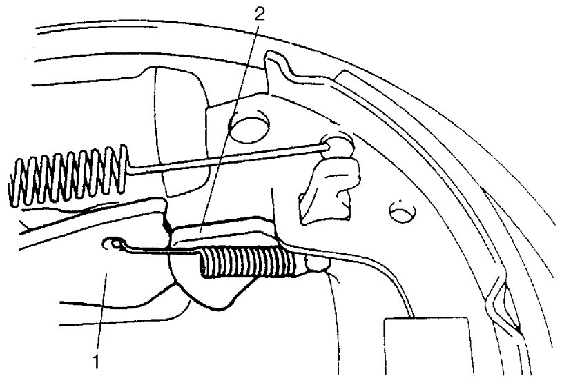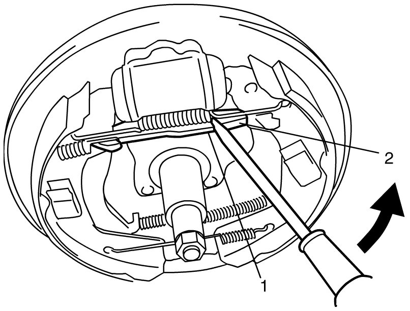 1) Before installing brake drum, to maximize brake shoe-to-drum clearance, put screwdriver between rod (1) and ratchet (2) and push down ratchet as shown in figure.