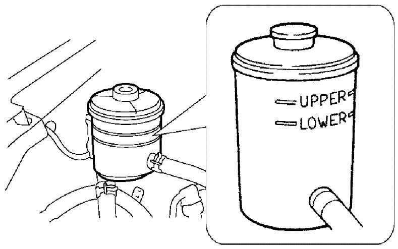 With engine stopped, check fluid level indicated on P/S fluid reservoir, which should be between "UPPER" and "LOWER" marks. If it is lower than "LOWER" mark, fill fluid up to "UPPER" mark.