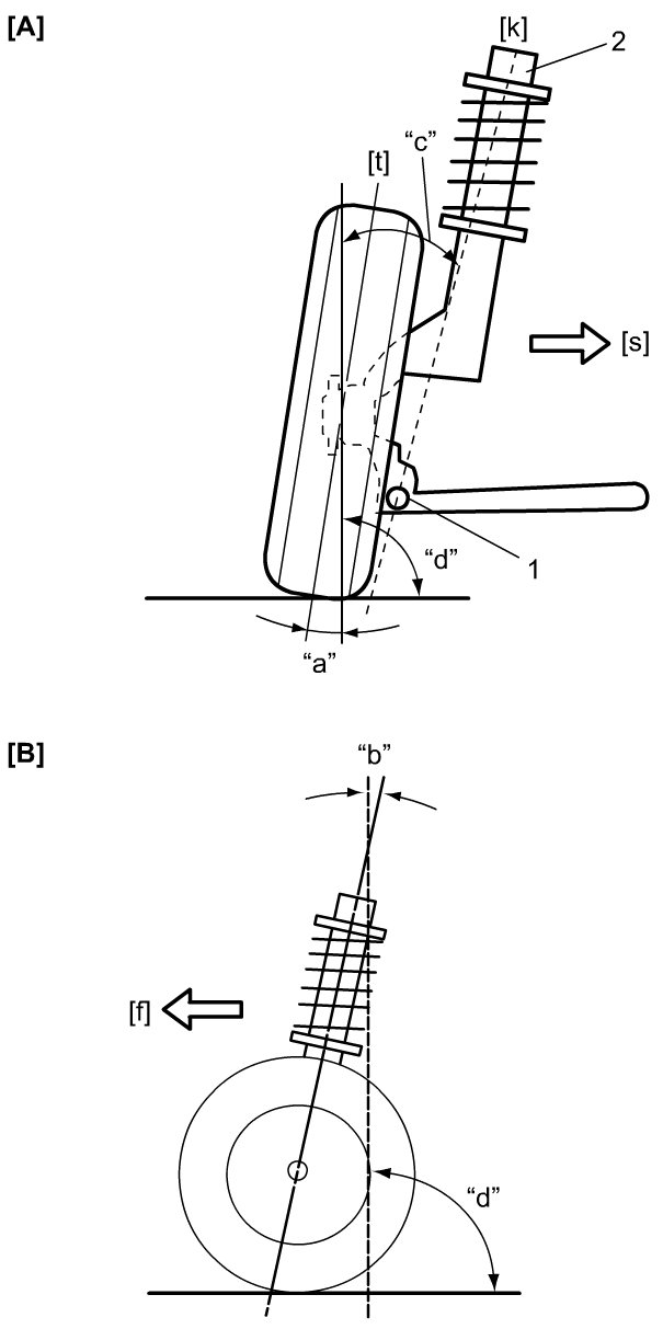 Check camber, caster and kingpin inclination angle by camber caster kingpin gauge (1) and turning radius gauge (2). If measured value is out of specified value, check following items for damage, deformation and crack. If any faulty condition is found, repair or replace defective item.